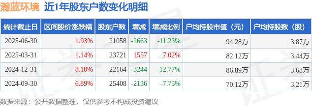 从股价来看,2025年3月31日至2025年6月30日,瀚蓝环境区间涨幅为1.93%,在此期间股东户数减少2663.0户,减幅为11.23%。